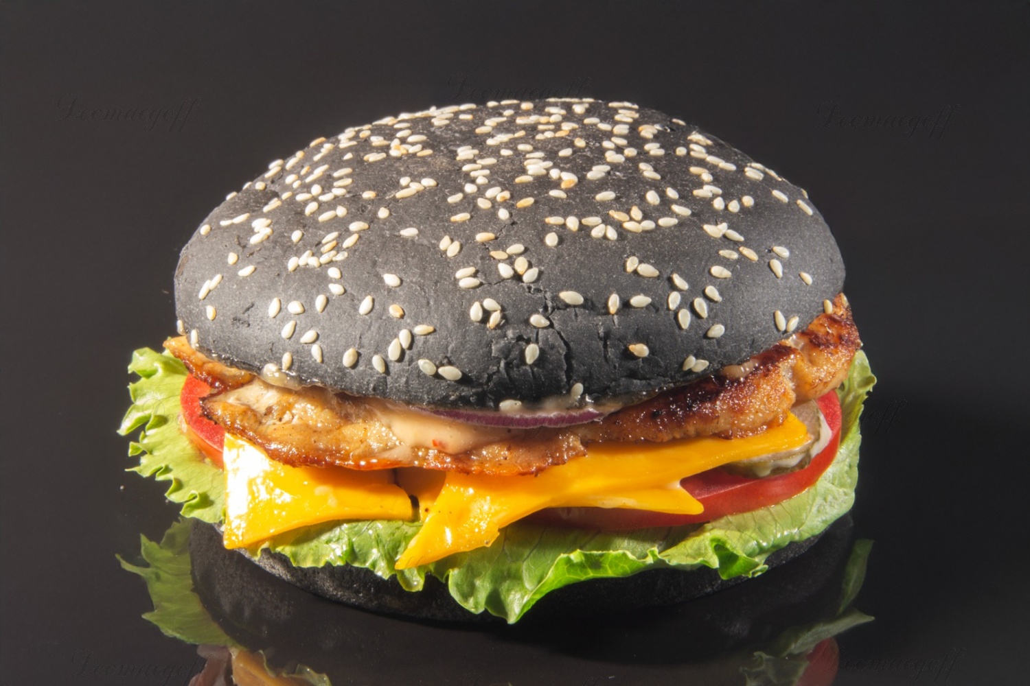 Состав: Черная булочка, куриная котлета, соус Чикен, лист салата, овощи, сыр Чеддер