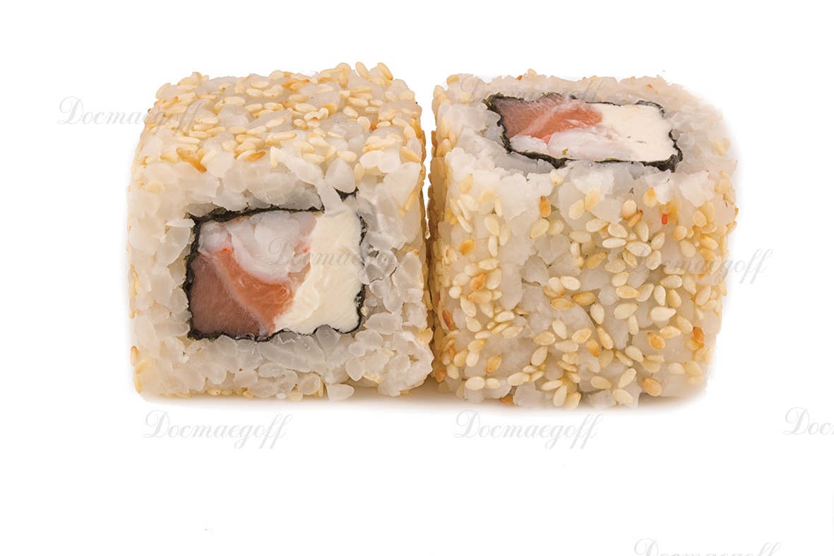 Состав: Копчёный лосось, креветки, кунжут, сыр филадельфия. 8 шт.