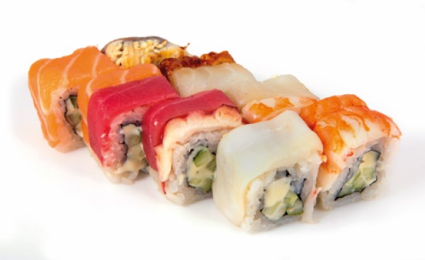 Состав: Лосось, тунец, окунь, угорь, креветки, осьминог, огурец, сыр плавленый. 8 шт