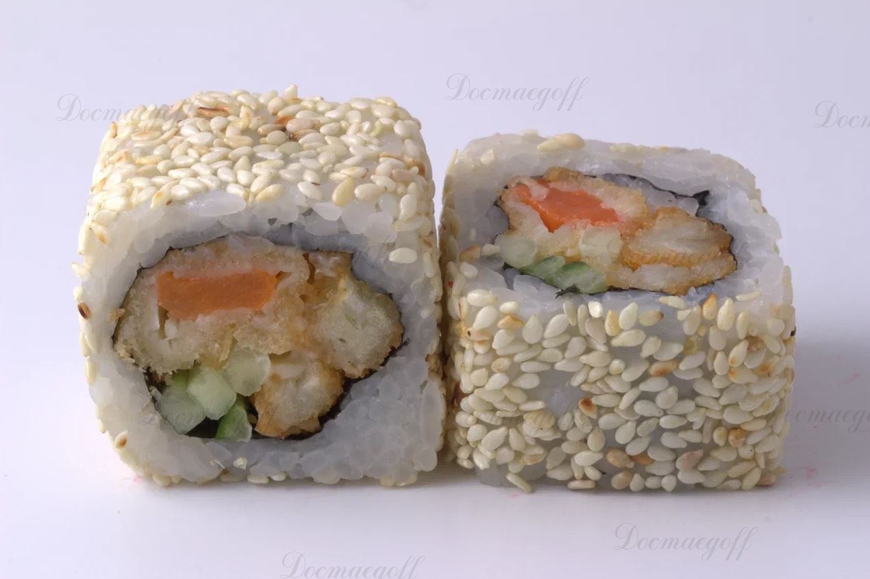 Состав: морковь в темпуре, огурец, майонез, лук фри, терияки соус, кунжут