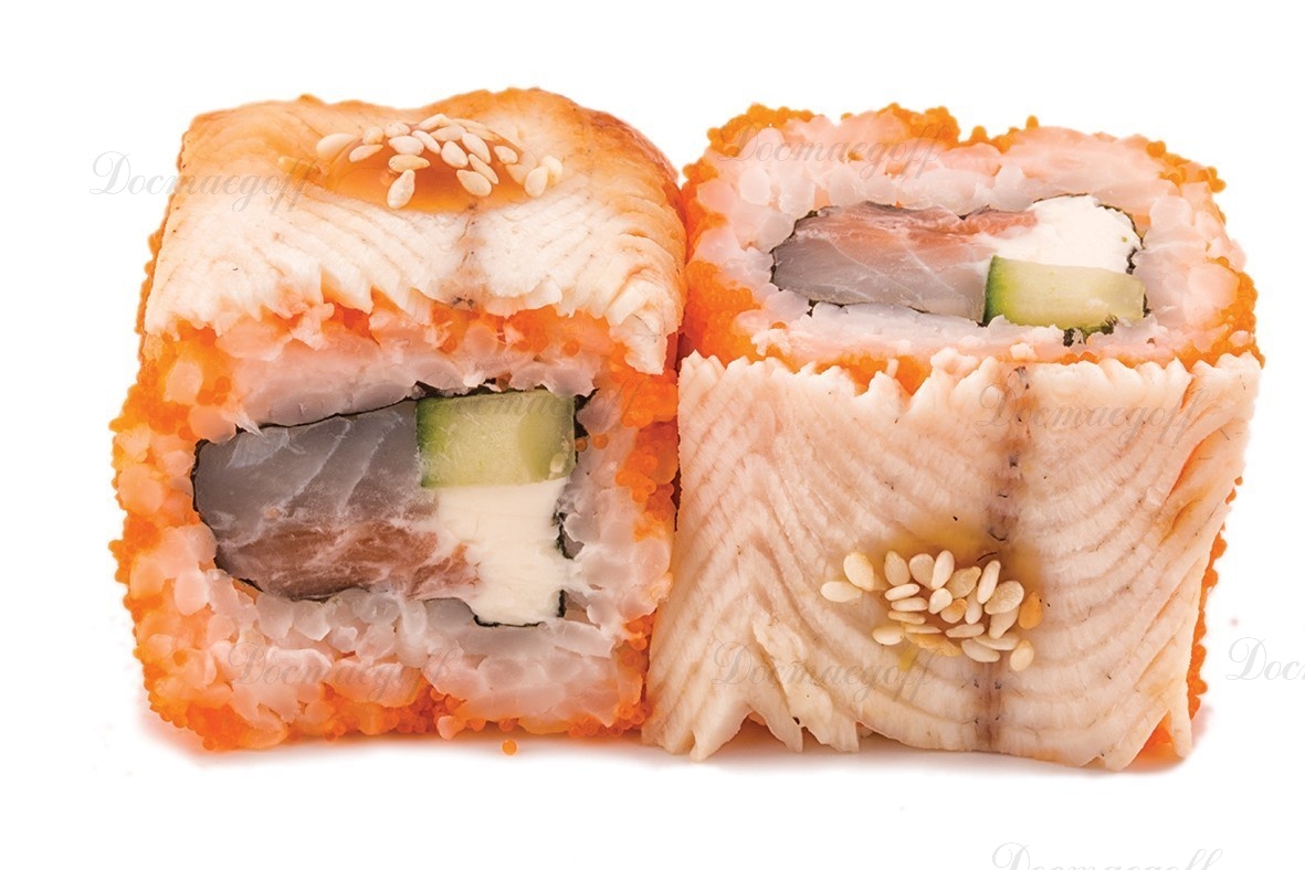 Состав: Лосось, угорь, окунь, сыр Филадельфия,масаго, огурец, спайси соус. 8 шт.