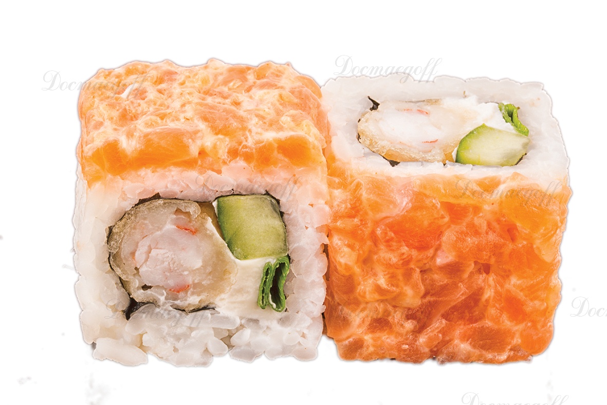 Состав: Лосось, спайси соус, сыр плавленный, креветки в кляре, огурец, лук зелёный. 8 шт.