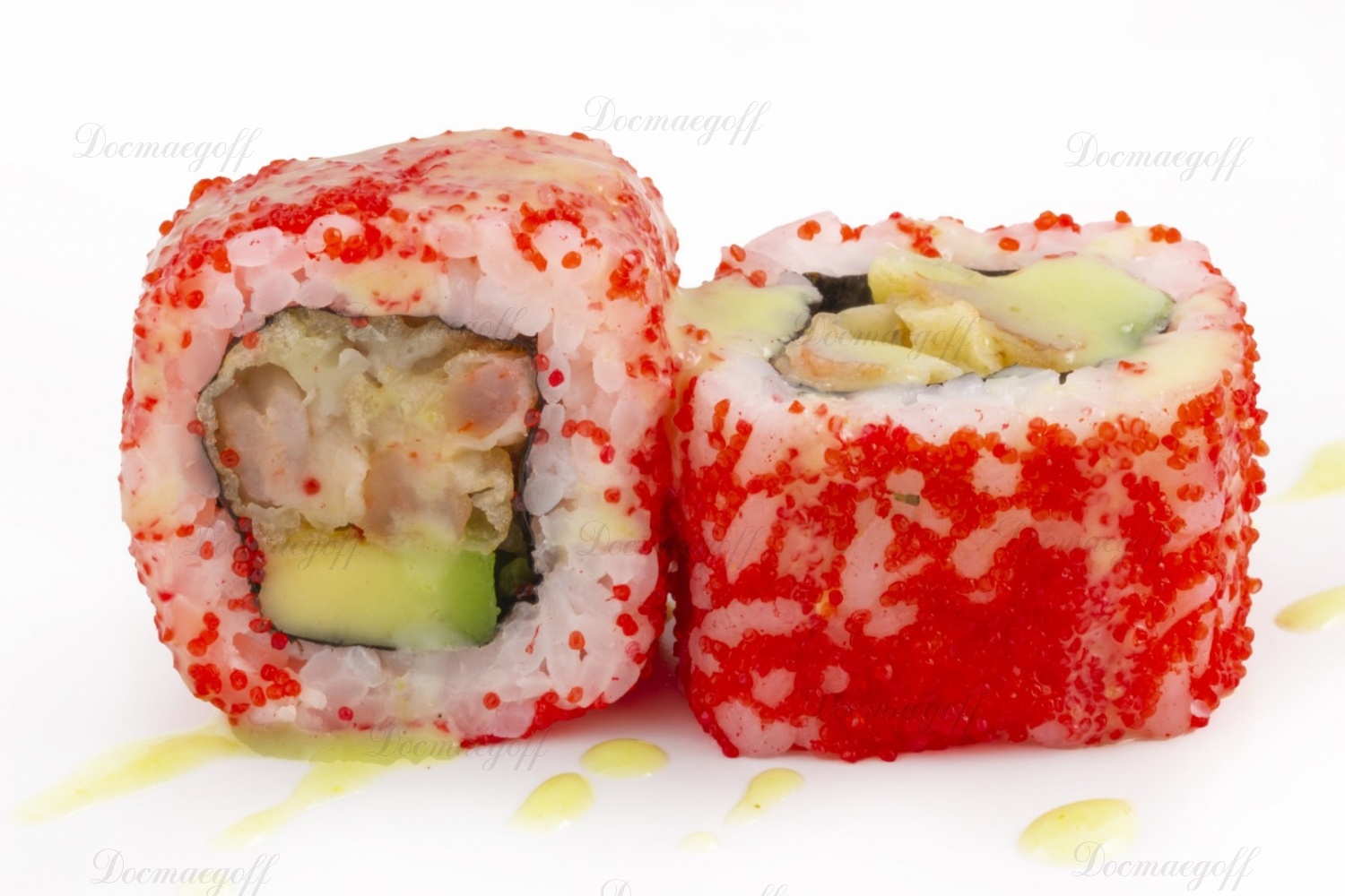 Состав: креветка в темпуре, авокадо, тобико, соус васаби